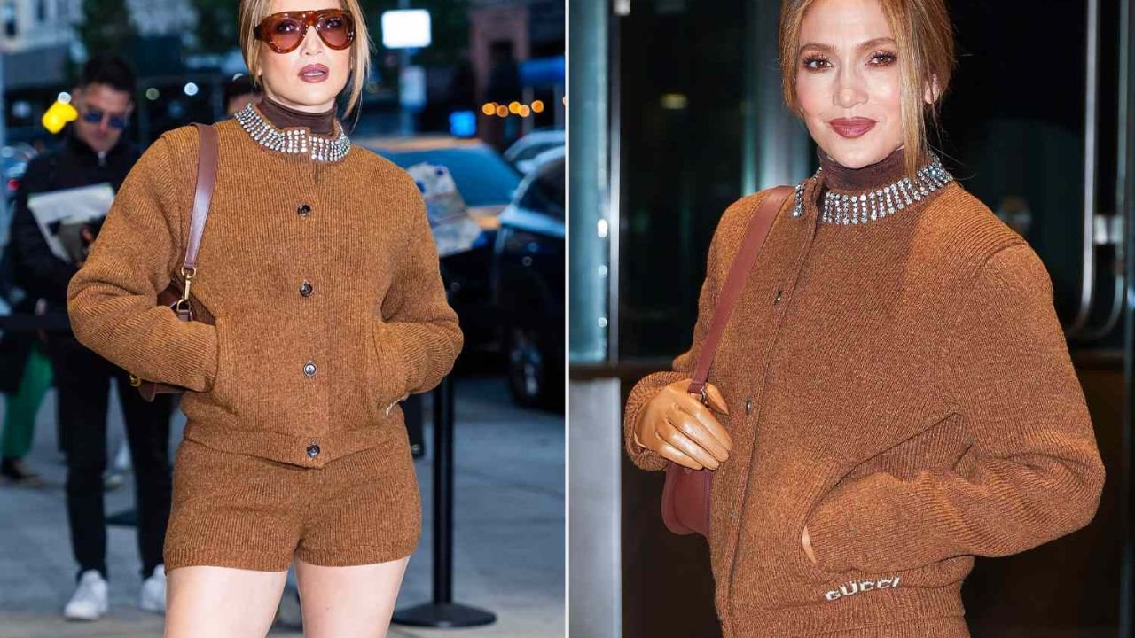 You Ask, We Answer: JLO Posed for Paparazzi in a Camel $4,390 Gucci Cardigan with the matching $890 Wool Shorts